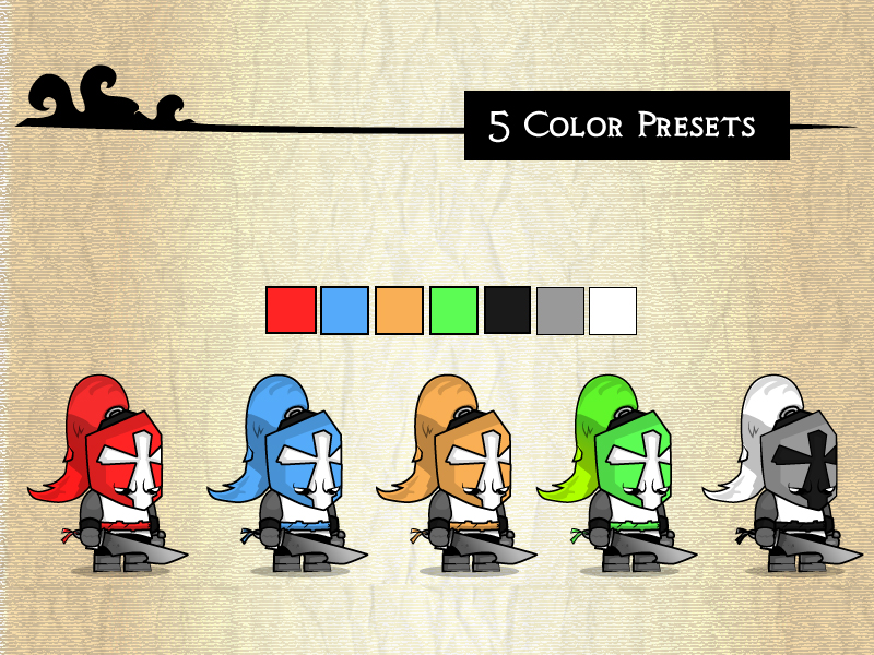 The package includes a red, an orange, a blue and a green crusader. Perfect to have a coop gameplay or make a multiplayer game where every color represents a different player.